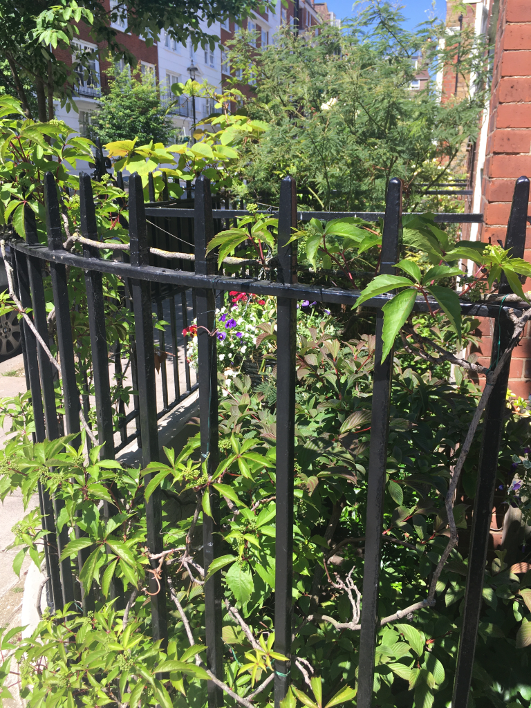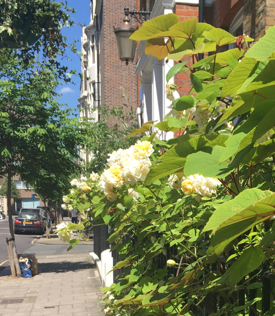 Two Sundays ago I took a slightly different way home, detouring to go past a red brick, smart Marylebone block and a specific ground and basement floor flat. A cottage garden, mini jungle, scented and lush climbing and reaching through the street railings from the basement area. Improbable but a fixture for the twenty or so years I’ve known it. A space packed with life in every season.