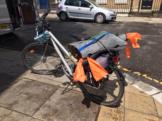 It was a monster. Weighed a ton even without the hefty battery pack. But oh how quickly I fell in love with zooming around the backstreets, finding the quiet routes. So I was eased into the pleasure of navigating around London without using the Underground on a power-assisted machine that required little physical effort. So I began to load her up. Cheap but capacious panniers acquired, a variety of elastic bungees in different lengths, thicknesses and hook configurations meant I could carry just about anything I wanted.